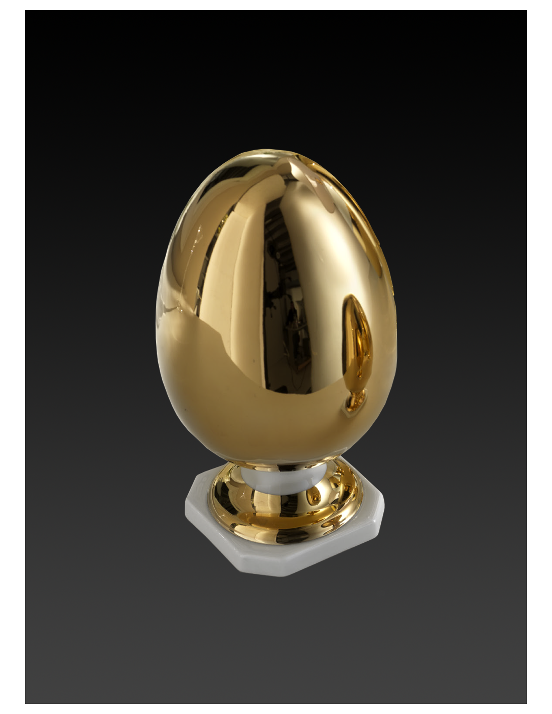 L'oggetto si distingue per la sua forma perfettamente ovale che riposa su una base circolare robusta, assicurando stabilità e sicurezza. La base stessa è realizzata con un accostamento armonioso di metalli preziosi e marmo, offrendo un contrasto visivo che mette in risalto la lucentezza e il colore dell'uovo. La finitura lucida è applicata con cura per garantire una superficie liscia al tatto e uno splendore ininterrotto, che cattura l'attenzione e valorizza gli ambienti circostanti.